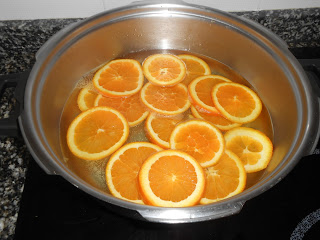 Rentem les taronjes,les eixuguem amb un drap,tallarem a rodanxes les taronges i les ficarem a una cassola cobertes d´aigua amb la cullerada de bicarbonat,això farà que la taronja no sigue tant àcida,Quan arranqui a bullir la traurem del foc i l´escorrerem.